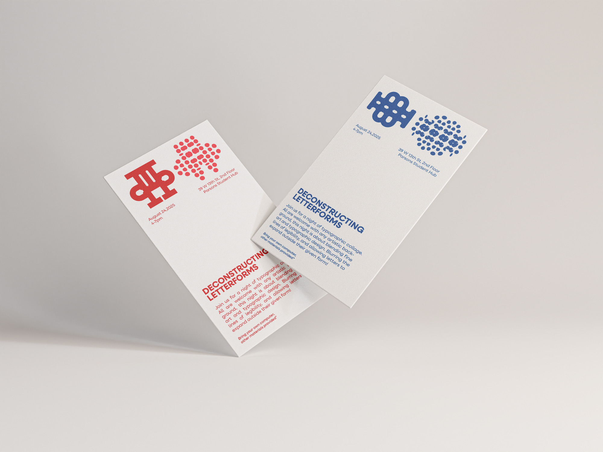 Deconstructed Letterforms, cards for a school collage event, created in Illustrator and Indesign.