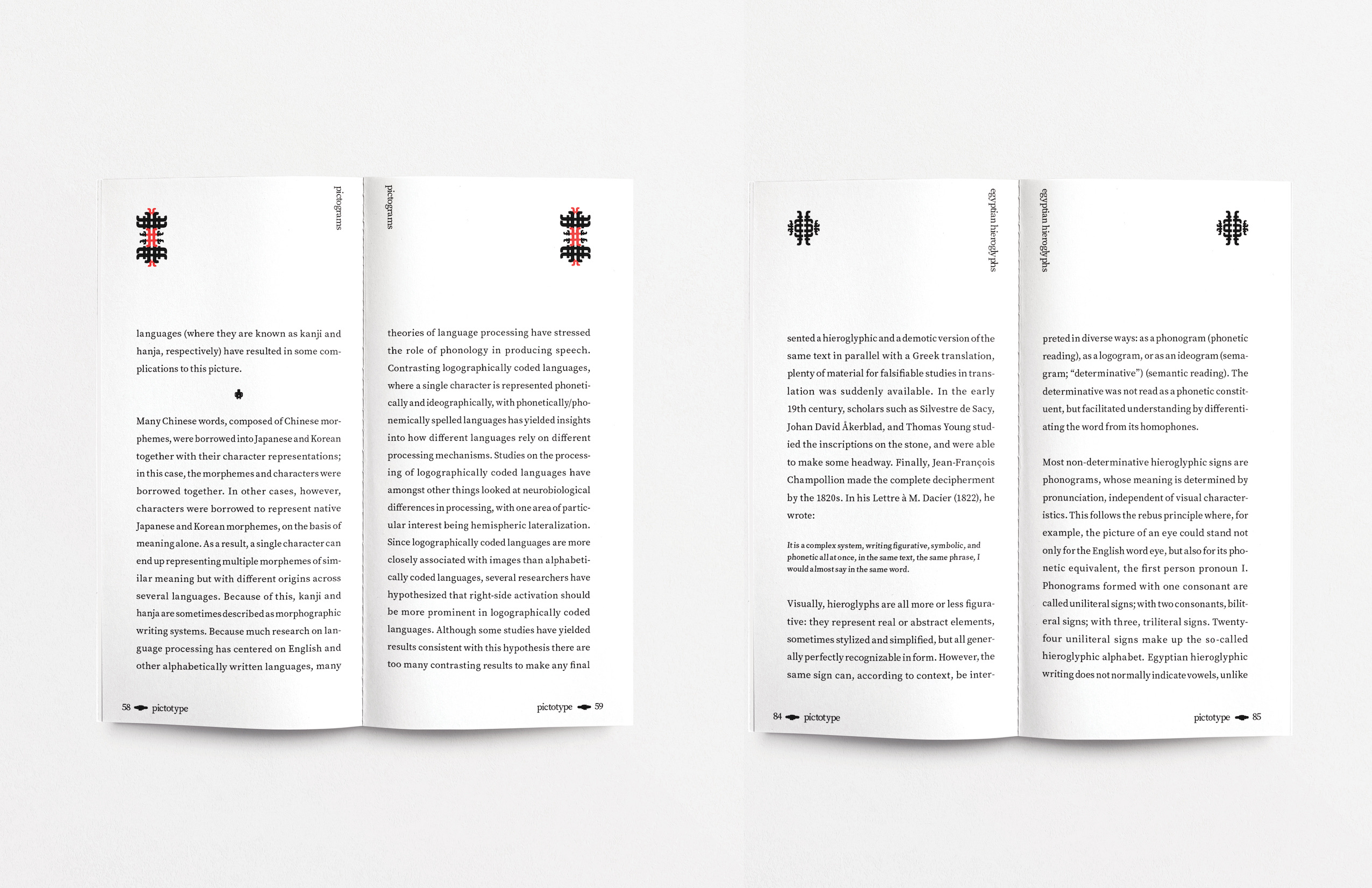 Pictotype, an exploration of how symbols evolved into language today, cover design inspired by 601bisangs 'Bite of the Golden Bee' created entirely with the letter 't', created in Illustrator in Indesign.